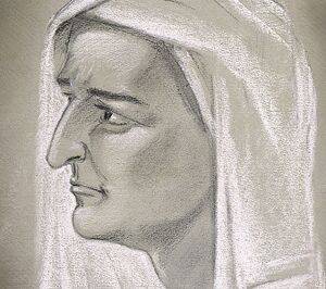 Questa donna è bella, con tratti specificamente ebraici. L’occhio è nero e profondo; non so perché mi ricorda quello del Battista. (NB: è la zia di Elisabetta, la madre del Battista). L’incarnato è leggermente bruno. La bocca, un po’ larga e ben disegnata, ha un’espressione austera, ma senza durezza. Il naso è lungo e fine, leggermente ricurvo alla base, un naso aquilino che si armonizza bene con gli occhi. È robusta ma non grassa. Ben proporzionata e alta, come si può intuire anche mentre è seduta[3].