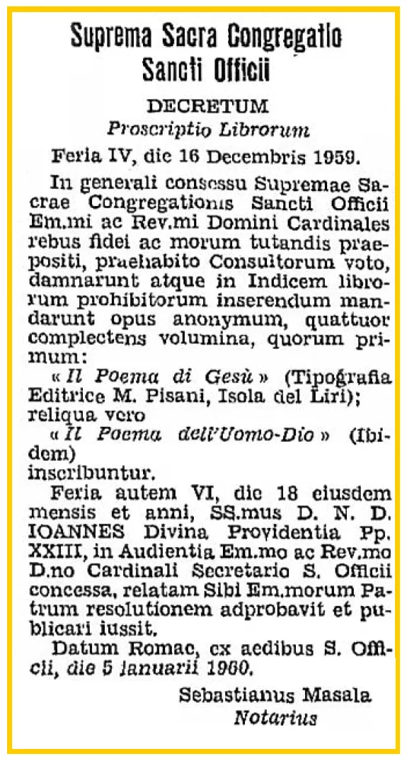| attuale | 18:36, 25 mar 2026 | 575 × 1 075 (102 KB) | Terranovas67 (discussione | contributi) | DECRETUM Proscriptio Librorum Feria IV die 16 Decembris 1959. In generali consessu Supremae Sacrae Congregationis Sancti Officii Em.mi ac Rev.mi Domini Cardinales rebus fidei ac morum tutandis praepositi, praehabito Consultorum voto, damnarunt atque in Indicem librorum Prohibitorum inserendum mandarunt opus anonymum, quattuor complectens volumina, quorum primum: “Il poema di Gesù” (Tipografia Editrice M. Pisani, Isola del Liri); reliqua vero “Il Poema dell'Uomo-Dio” ( Ibidem ) inscribuntur... |